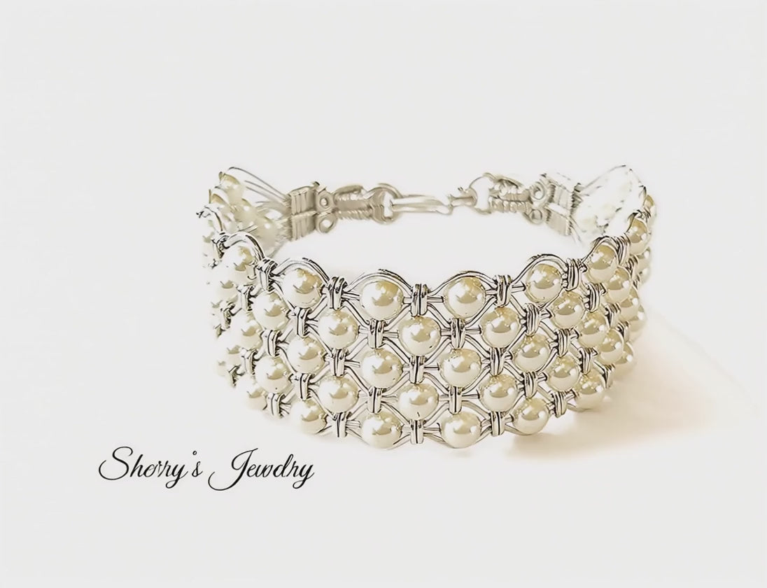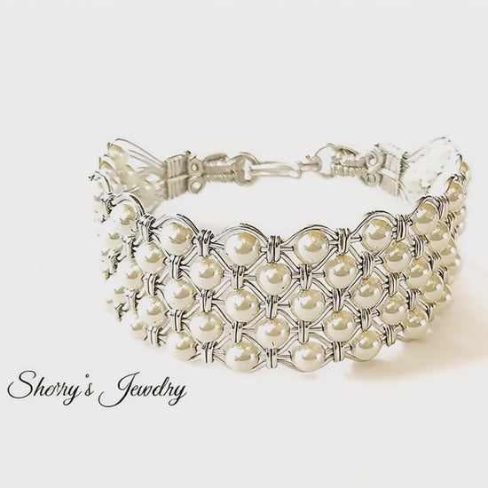 This stunning pearl bracelet was created meticulously, each high-quality Swarovski crystal pearl was woven into the band of this bracelet by hand in high-quality .925 sterling silver wire. The ends of this bracelet were woven and sculpted and a heavy duty hook and eye clasp provides the final finish. It snaps for a secure lock.